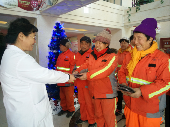 圖為青島紅房子?jì)D科醫(yī)院為環(huán)衛(wèi)工人贈(zèng)送手套口罩等御寒物品\u00A0