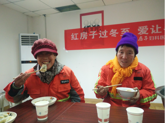 圖為環(huán)衛(wèi)工人阿姨們正在開心地吃冬至愛(ài)心水餃\u00A0