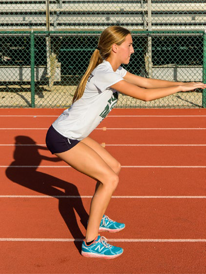 原地站直,雙腳分開比肩部稍寬,手臂向前伸。緩慢地彎曲膝關(guān)節(jié)、髖關(guān)節(jié)和踝關(guān)節(jié)。通過收緊腹部和背部肌肉群讓背部保持直立。下巴抬起,與地面平行。在下降動作結(jié)束的時候,小腿和大腿形成的夾角(在膝蓋后方)應(yīng)該在120 ~ 140 度之間。為了增加阻力,可以讓雙手拿著藥球或啞鈴。