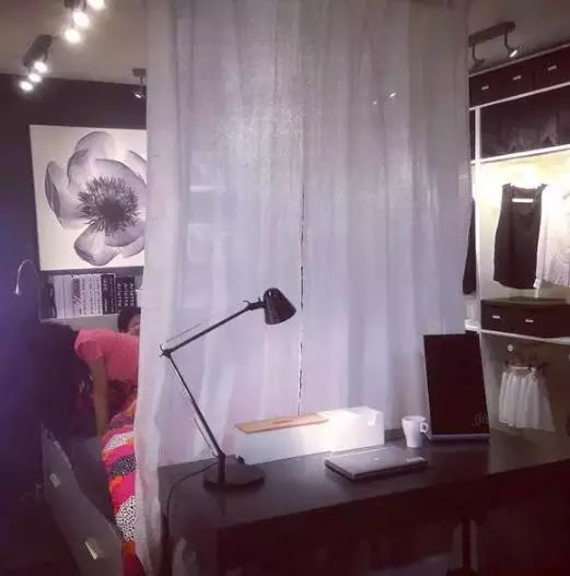 許多開間融合了不同功能,如何讓寫字臺與床完美共存,這個樣板間給出了很好的示范:把寫字臺放到床尾,用兩片紗簾隔開兩個區(qū)域,然后你獲得了舒適的睡眠區(qū),以及干凈正經(jīng)的工作區(qū)。