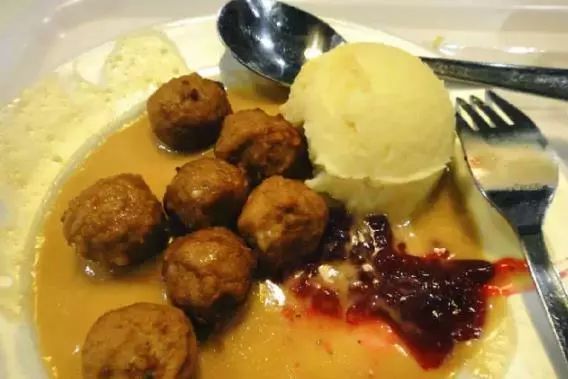 在宜家美食中排名第二的瑞典肉丸,10粒15.5元,瑞典傳統(tǒng)配方,肉丸、越橘果醬、瑞典肉丸汁配煮馬鈴薯,肉丸非常有彈性呢,一口咬下去,還有淡淡的奶香味。