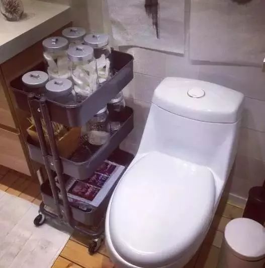 一個儲物車:其實這個儲物車極大的解放了浴室柜的臺面儲物,你可以徹底告別擠滿瓶瓶罐罐的浴室柜了,讓他們都緊湊地擠在這里吧。