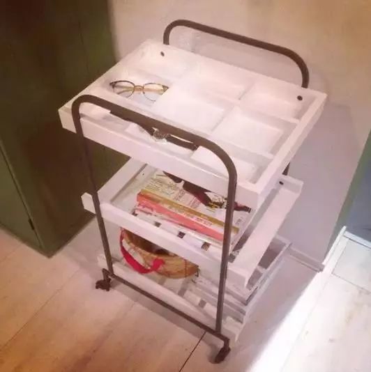 這個小推車被放在臥室的床邊,它基本已經(jīng)可以讓床頭柜下崗了,一層有條理的收納零碎物品,二層、三層放書、雜志以及大件雜物。更重要的是:它能到處移動!