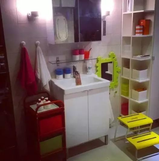 你沒發(fā)現(xiàn)看點是兩個一大一下高低錯落的鏡子么,大鏡柜爸爸媽媽用,小鏡子寶貝兒用,你們終于可以一起對鏡貼花黃了,那個黃色的腳蹬也方便寶貝兒自己用爸爸媽媽的洗手池,小臉盆再見。