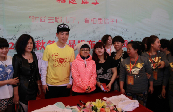 當日六點,全體工作人員熱烈歡迎金龜子和毛毛蟲的到來,金龜子和毛毛蟲在橫幅題名!并為柏惠童裝簽名紀念!