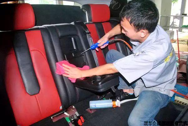 內(nèi)飾細(xì)致用內(nèi)飾清潔海綿配合清潔液進(jìn)行擦洗,擦洗后使用風(fēng)槍進(jìn)行吹干。