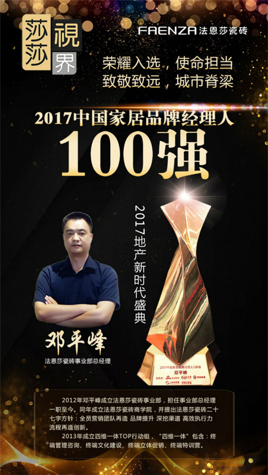 2017年12月12日,由新浪財(cái)經(jīng)、樂居、中房研協(xié)、上海證券報(bào)和中國(guó)企業(yè)家聯(lián)合主辦的“2017中國(guó)地產(chǎn)、家居、物業(yè)經(jīng)理人“評(píng)選結(jié)果在京揭曉。本次評(píng)選首次聚焦房產(chǎn)、家居和物業(yè)三大行業(yè),吸引全國(guó)98座城市1083名地產(chǎn)、家居和物業(yè)公司的領(lǐng)導(dǎo)人及高管參與。通過(guò)知名度、戰(zhàn)略視野、管理力、領(lǐng)導(dǎo)力等多個(gè)維度綜合考量,就個(gè)人價(jià)值與社會(huì)貢獻(xiàn)做出綜合評(píng)估。作為瓷磚十大品牌,中國(guó)時(shí)尚瓷磚領(lǐng)軍品牌——法恩莎瓷磚事業(yè)部領(lǐng)軍人,鄧平峰先生榮獲“2017中國(guó)家居品牌經(jīng)理人100強(qiáng)”。