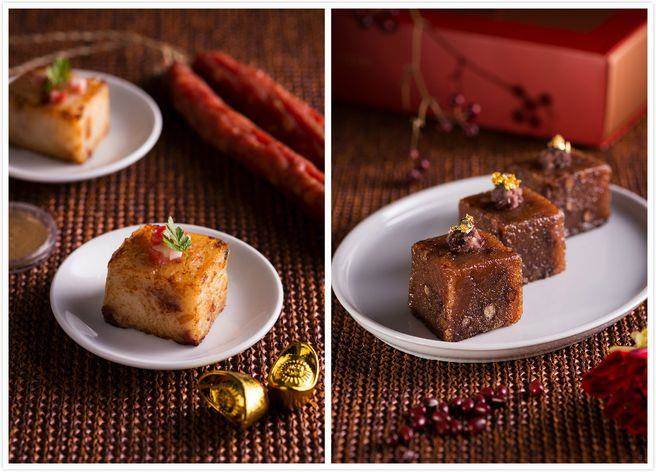 廣式臘味蘿卜糕(左)、臺(tái)式紅豆年糕(右)。(誠(chéng)品行旅提供)