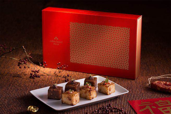 春節(jié)限定「甘粹帶回家」外帶年菜(左)、「春節(jié)伴手首選」甜粿(右)。(臺(tái)南老爺行旅提供)