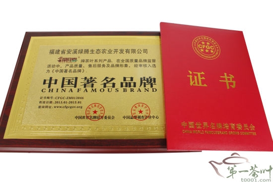 近日,經中國世界名牌培育委員會、中國品牌調查評價中心等兩家權威機構綜合考證及專家評審委員會審核,最終授予:福建省安溪綠騰生態(tài)農業(yè)開發(fā)有限公司茶葉系列產品“中國著名品牌”的榮譽稱號,并頒發(fā)榮譽證書和獎牌。