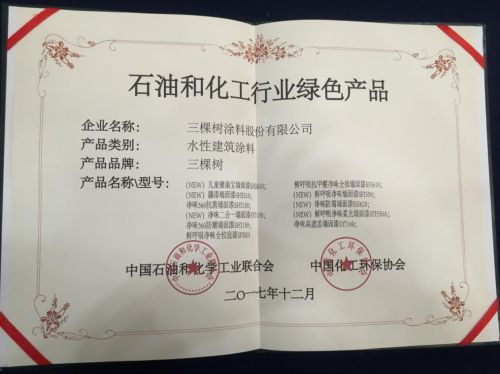 12月13日,由中國(guó)石油和化學(xué)工業(yè)聯(lián)合會(huì)、中國(guó)化工環(huán)保協(xié)會(huì)主辦的 “2017年石油和化工行業(yè)綠色發(fā)展大會(huì)”在北京召開(kāi)。本次大會(huì)不僅總結(jié)了行業(yè)綠色發(fā)展經(jīng)驗(yàn),還發(fā)布了行業(yè)內(nèi)首批43家綠色工廠和45項(xiàng)綠色產(chǎn)品,三棵樹(shù)涂料股份有限公司及11項(xiàng)水性建筑涂料成功入選。