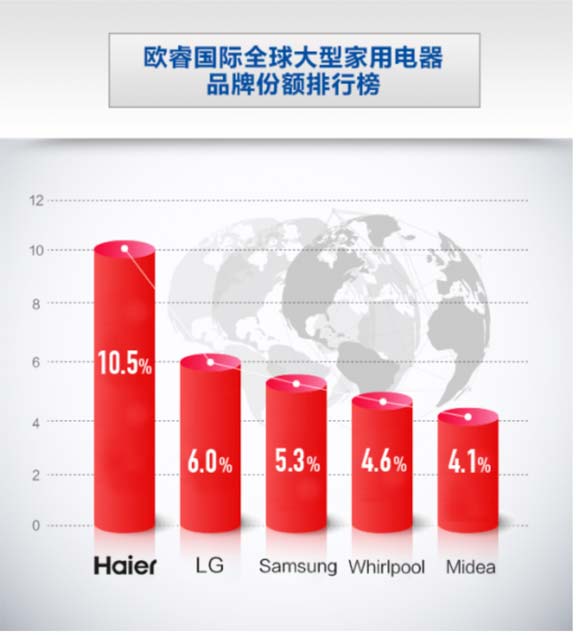 自主創(chuàng)牌在為“中國制造”正名的同時,也為海爾帶來了強大的市場影響力。歐睿國際最新數(shù)據(jù)顯示,在全球大型家用電器領域,海爾以10.5%的品牌份額位居榜首,這也是海爾第9次蟬聯(lián)全球第一,成為中國家電全球化第一品牌。