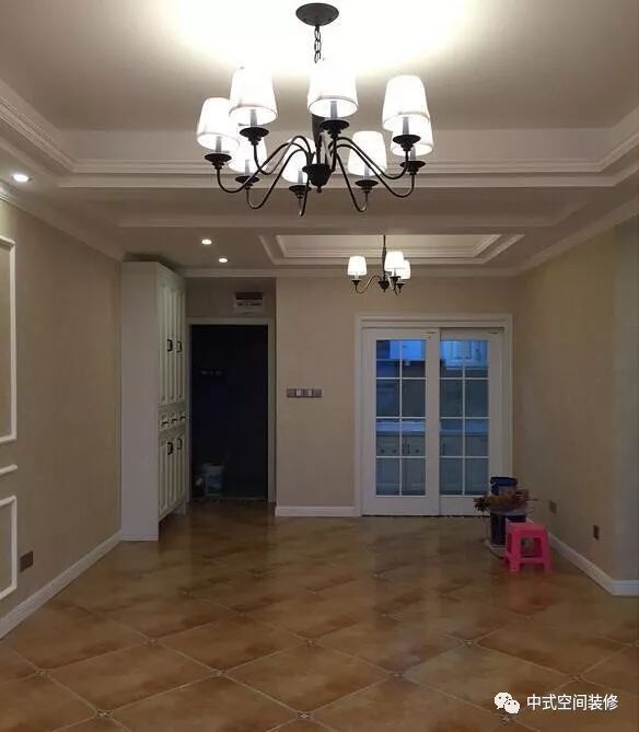 入戶和餐廳,沒上家具空蕩蕩的,餐廳吊頂也是獨立的,吊燈和客廳一個款式的,燈數(shù)量少了點。