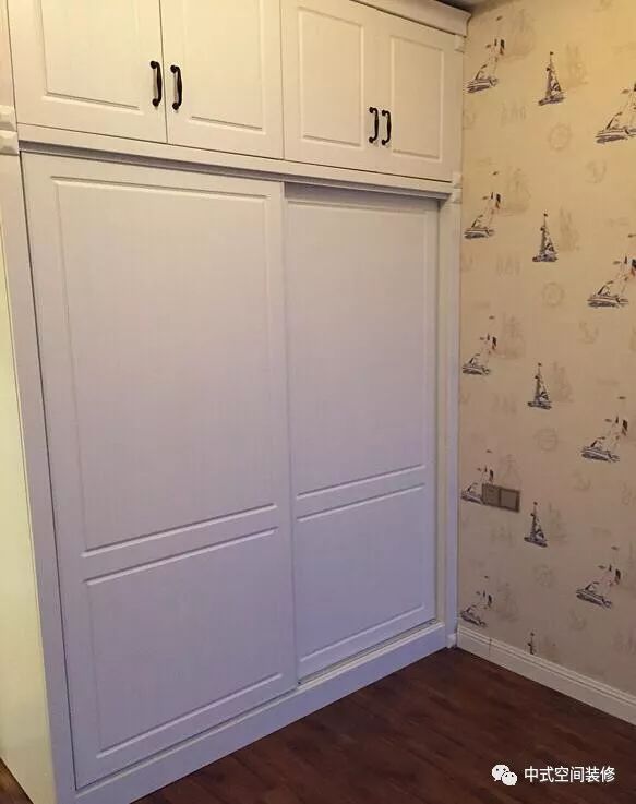 兒童房空間比較小,所以衣柜選擇的移門,白色的很漂亮呢。墻面用壁紙裝飾,圖案比較適合孩子。