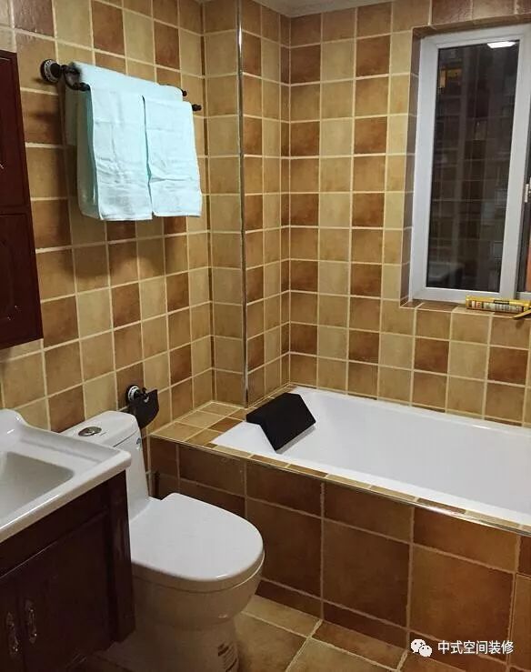 主衛(wèi)裝修還行,統(tǒng)一用的仿古磚,外衛(wèi)安裝的蹲便器所以主衛(wèi)就用馬桶了,還弄了個浴缸可以泡澡。