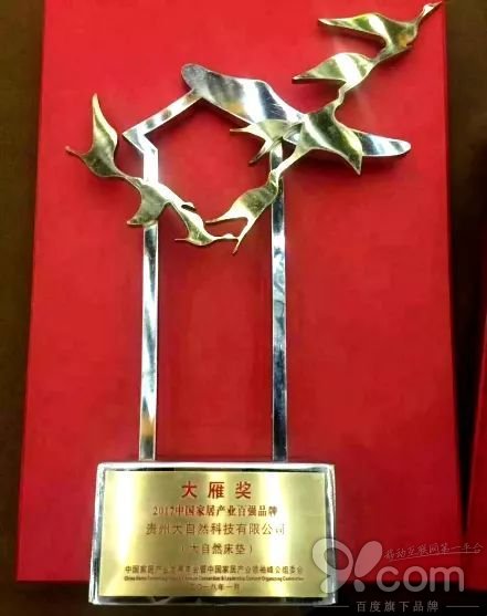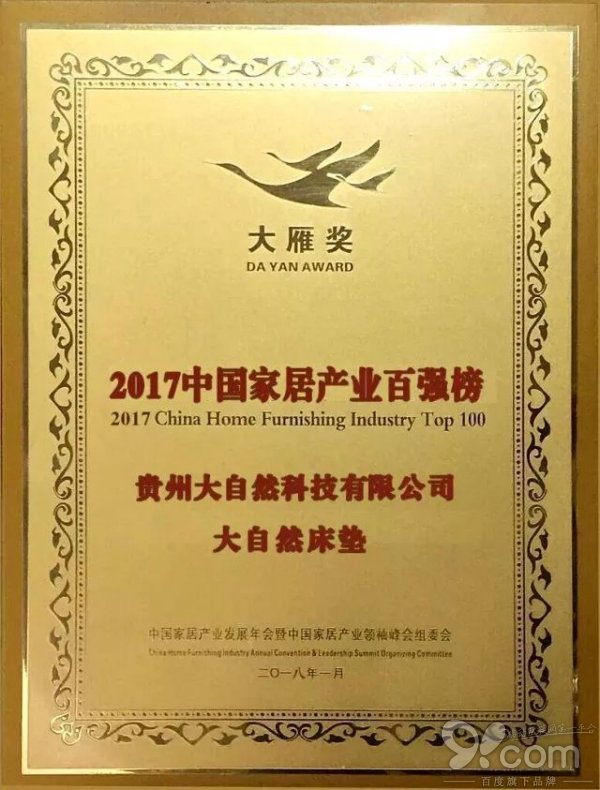 大雁鳴空,自然天籟2018年1月6日,在家居行業(yè)有著“奧斯卡”美譽(yù),行業(yè)最具影響力、最具關(guān)注度——中國家居產(chǎn)業(yè)百強(qiáng)榜 “大雁獎(jiǎng)”頒獎(jiǎng)盛典在北京·國家會(huì)議中心隆重召開。大自然棕床墊憑借其良好的品牌形象和行業(yè)領(lǐng)先地