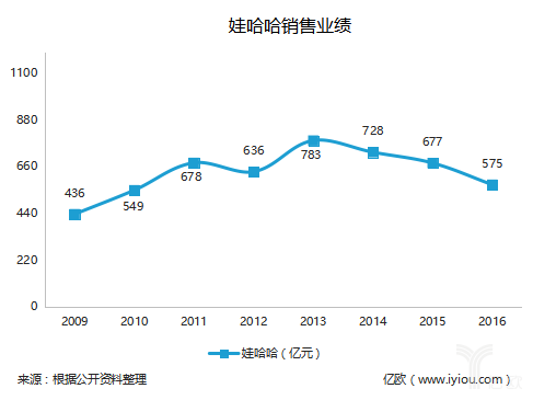 2013年娃哈哈營(yíng)收近800億,宗慶后曾提出2014年?duì)I收過(guò)千億的目標(biāo)。然而一年后收入暴跌226億,娃哈哈離千億的目標(biāo)越來(lái)越遠(yuǎn)。浙商雜志的統(tǒng)計(jì)數(shù)據(jù)顯示,其營(yíng)收從2013年的最高峰782億元,已經(jīng)下滑至2016年的575億元。