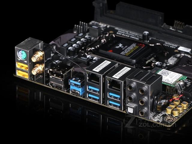 背部接口這里我們看到配置的還是很全的,PS/2鍵鼠接口,兩個USB 2.0電競接口,無線網卡的天線。旁邊是HDMI/DP的視頻接口,6個USB 3.0接口(其中一個為Type-C形式存在)。雙千兆網卡,分別為Intel I219V和Realtek RTL8118AS。一組音頻接口,芯片為ALC 1150。