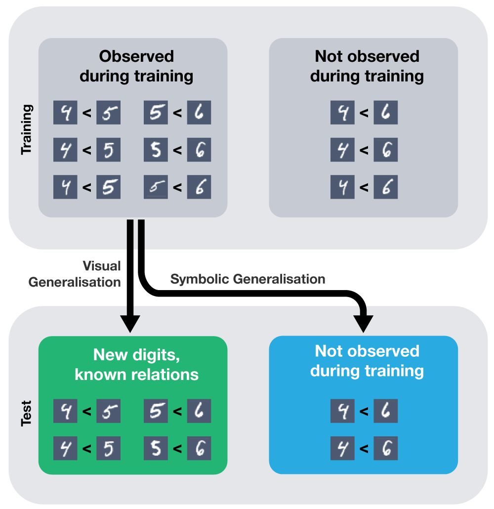 給標準的深度學習模型(如帶 MLP 的卷積神經網絡)提供足夠的訓練數據,它可以有效地解決這個任務。一旦網絡經過了訓練,你就可以向網絡輸入一對它未見過的圖像,網絡可以正確地對其分類。然而,只有用每對數字的多個樣本進行訓練,網絡才能正確地泛化。這種模型的視覺泛化能力很好:泛化到新的圖像上,假定它已經見過測試集中的所有數字對(參見下圖中的綠框部分)。但它無法進行符號泛化:泛化到它從未見過的數字對(參見下圖中的藍框)。Gary Marcus 和 Joel Grus 近日通過發人深省的文章指出了這一點。