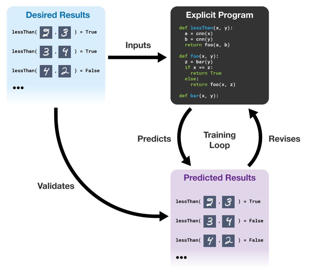 ?ILP 和標準的神經網絡不同,它可以進行符號泛化;?ILP 也和標準的符號程序不同,它可以進行視覺泛化。它從可讀取、可解釋和可驗證的樣本中學習顯式的程序。向?ILP 提供部分樣本集(期望結果),它可以生成一個滿足需求的程序。它利用梯度下降來搜索程序空間。如果程序的輸出和參考數據的期望結果相沖突,系統將修正程序以更好地匹配數據。