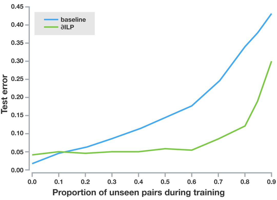 ?ILP 能夠進行符號泛化。在它見過足夠的 x < y、y < z、x < z 樣本之后,它就會考慮 < 關系可傳遞的可能性。一旦它意識到這條泛化規則后,就可以將其應用到未見過的新的數字對。