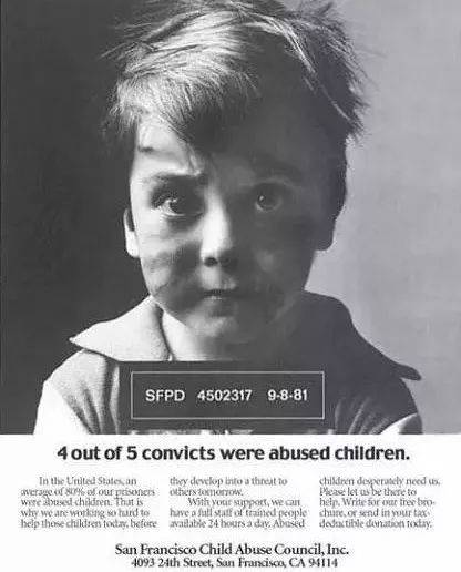 這張著名的海報上寫著:在美國,平均 80%的囚犯曾是受虐待的兒童,正因如此,我們才會如此努力地來幫助今天的受虐兒童,以免他們?nèi)蘸蠼o他人造成威脅。