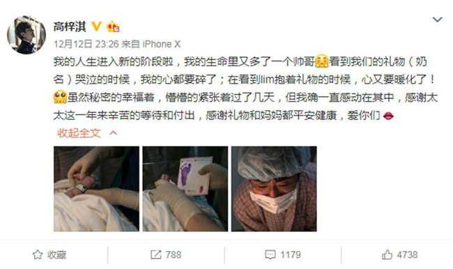 12月12日,高梓淇在微博曬出寶寶腳丫照并且宣布和蔡琳的兒子出生:“我的人生進(jìn)入新的階段啦,我的生命里又多了一個帥哥?吹轿覀兊亩Y物(奶名)哭泣的時候,我的心都要碎了;在看到lim抱著禮物的時候,心又要暖化了!”