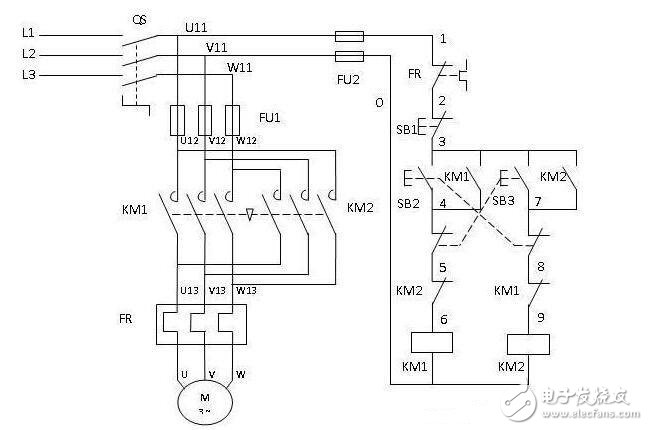在此圖中,按下SB3,可以直接斷開SB2,使電動機進行反轉(zhuǎn)。
