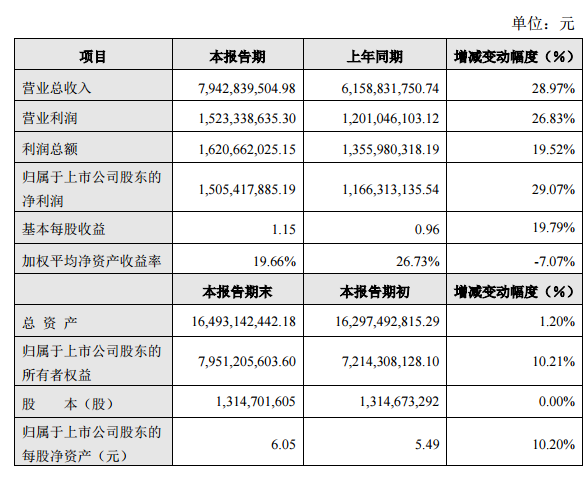 期內(nèi)實現(xiàn)營業(yè)收入約79.43億元,同比增長28.97%;歸屬于上市公司股東的凈利潤約為15.05億元,同比增長約 29.07%;實現(xiàn)基本每股收益 1.15 元/股,同比增長約19.79%。