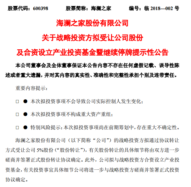 金融之家1月31日訊,海瀾之家昨晚發(fā)布公告稱,擬出讓5%股份引進(jìn)戰(zhàn)略投資方,雙方將合資設(shè)立產(chǎn)業(yè)投資基金,并將于2月5日前公告進(jìn)展并申請復(fù)牌。