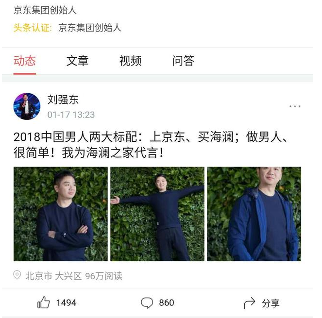 劉強(qiáng)東1月17日發(fā)布微頭條稱:“2018中國男人兩大標(biāo)配:上京東、買海瀾;做男人、很簡單!我為海瀾之家代言!”為此,他還穿上海瀾之家配圖三張。