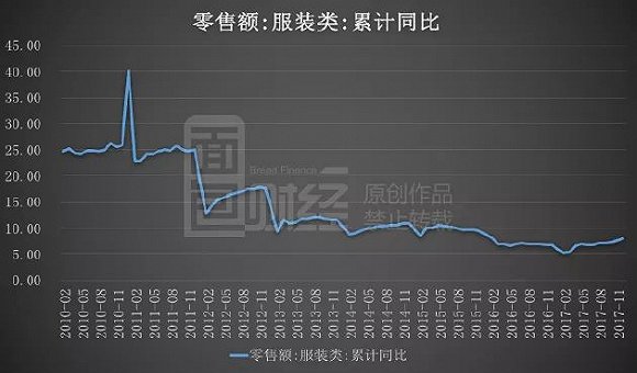 根據(jù)國家統(tǒng)計局數(shù)據(jù),自2011年初以來,服裝類零售額累計同比增速持續(xù)下滑,經(jīng)歷多年的行業(yè)調整以及去庫存后,隨著消費升級效應顯現(xiàn),2017年8月,服裝類零售額累計同比增速超過上年同期,增速開始回升。