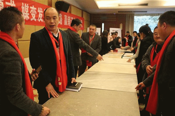 歐美陶瓷四川分公司總經(jīng)理鄭顯軍(左一)和歐美陶瓷四川分公司副總經(jīng)理陸子民先生(右一)為積極發(fā)言的經(jīng)銷商頒獎
