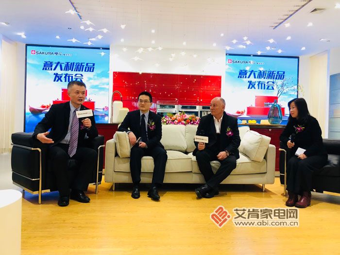 意大利設計師與SAKURA櫻花整體廚房負責人沈銘中(左一)、SAKURA櫻花總經(jīng)理張永政(左二)接受媒體群訪