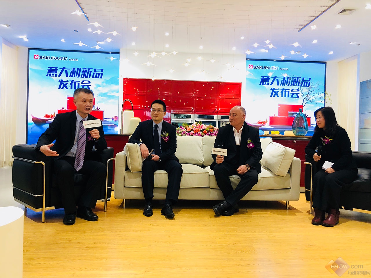 SAKURA櫻花總經(jīng)理張永政(左二)、整廚副總沈銘中(左一)、意大利設(shè)計(jì)師(右二)接受媒體采訪