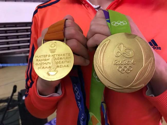 大概是很少有同時握有兩屆奧運金牌的機會,大家都禁不住想拿在手里感受一下不同,結(jié)論是:里約的最大,也最重,但是從魏秋月的金牌掉在地上就磕壞一塊來看,里約的金牌質(zhì)量一般。