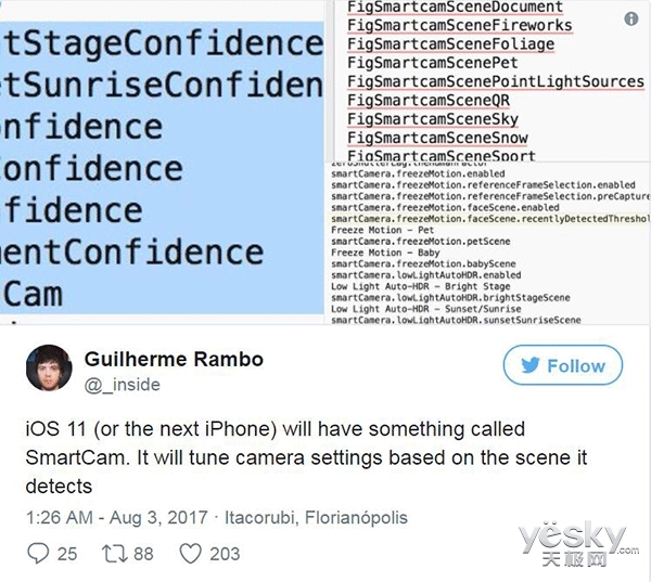 【天極網(wǎng)IT新聞頻道】由于HomePod內(nèi)置特殊版本的iOS系統(tǒng),因此細心的開發(fā)者們從固件中“窺探”到了關于iPhone 8的各種參數(shù)和新功能。近日,開發(fā)者Guilherme Rambo又在HomePod固件中發(fā)現(xiàn)了一些iPhone8的秘密,iPhone 8相機可能會引入新的“SmartCam(智能相機)”功能,代碼表明,SmartCam可以針對特定的拍攝場景調(diào)整拍攝算法,以此拍出最好的照片。