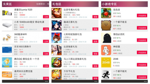V5.1新版的主要改進(jìn)之一,用戶可隨意選擇新注冊(cè)賬戶、QQ賬戶、達(dá)派ID三種簡(jiǎn)便快捷地方式注冊(cè)或登陸WP社區(qū)。在火爆討論區(qū)里,你可以結(jié)識(shí)更多有愛(ài)的WP手機(jī)用戶,獲得豐富的玩機(jī)或游戲經(jīng)驗(yàn),還能在禮包區(qū)領(lǐng)取《我叫MT oline》、三國(guó)艷義等流行游戲的達(dá)派獨(dú)家禮包。每天在WP社區(qū)簽到和發(fā)帖,不斷累積你的社區(qū)賬戶積分,就可以在兌獎(jiǎng)區(qū)兌換從QQ黃鉆、QQ會(huì)員、京東禮品卡,大容量移動(dòng)電源到諾基亞Lumia 1520等等豐厚大禮。這么多誘人獎(jiǎng)品就在那里等著你,你愿意放過(guò)它們嗎?