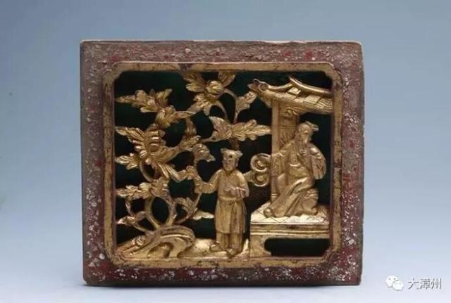 清代金漆木雕人物紋裙板,它長(zhǎng)21.9厘米、寬23.8厘米、厚2.7厘米,是國(guó)家三級(jí)文物,藏于漳州市博物館