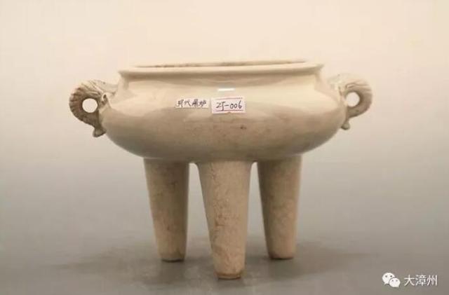 清代漳窯米黃釉雙象耳瓷三足爐,它口沿寬21.5厘米、口徑14.2厘米、高14.5厘米,藏于南靖縣博物館藏,是新認(rèn)定的二級(jí)文物。
