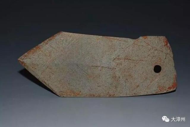 圖為青銅時(shí)代穿孔石戈,它長(zhǎng)為長(zhǎng)16.4厘米、寬6.8厘米、厚0.6厘米,是國(guó)家二級(jí)文物,藏于南靖縣博物館