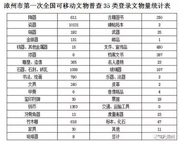 此次普查成果顯示,漳州市共有國(guó)有文物收藏單位33家,藏品17513件/套(實(shí)際數(shù)量25308件),其中,一級(jí)文物82件/套、二級(jí)文物264件/套、三級(jí)文物3856件/套、一般文物9953件/套、未定級(jí)3358件/套。