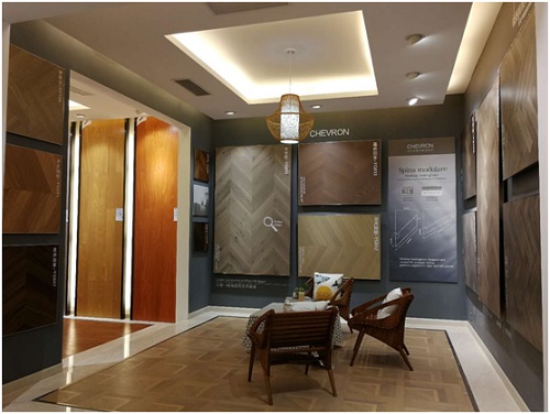 除此之外,私享系列的魚骨拼花角度藝術,讓人一享視覺盛宴。地板不規則的斜角設計,鱗次櫛比,錯落有致,成為會場上的一大矚目亮點。