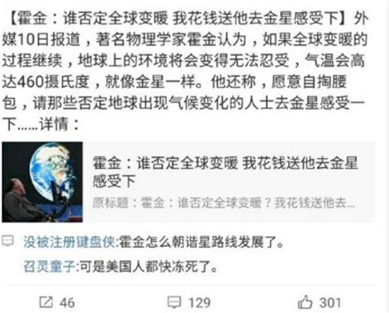 霍金霸氣發(fā)聲,誰否定全球變暖我花錢送他去金星!霍金在大家的印象里應該是一位很嚴肅的科學怪人,一個很深沉的學者形象!可沒想到他也有如此幽默的一面!