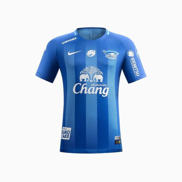春武里2018主場(chǎng)球衣采用球隊(duì)標(biāo)志性的藍(lán)色外觀以及劍條衫設(shè)計(jì),藍(lán)色球衣上加入由白色細(xì)斜紋組成的三條白色豎條紋,并采用動(dòng)感十足的漸變效果,展現(xiàn)出球隊(duì)所在的春武里府所擁有的美麗海洋景觀。