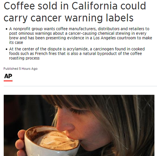 非營利組織“毒物教育和研究咨詢委員會”在2010年向洛杉磯郡高等法院提起訴訟,指星巴克和7-11等販賣咖啡的知名商店并未提出清楚、合理的警告,告知顧客喝咖啡可能會使他們攝入會致癌的化學(xué)物質(zhì)丙烯酰胺。