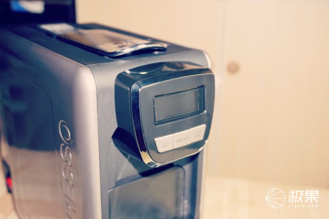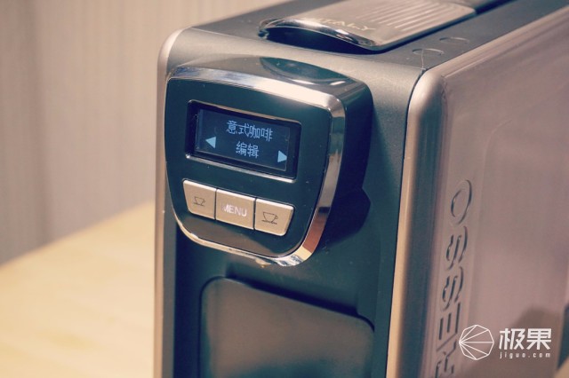 機身前端是一塊顯示屏以及操作的按鈕,按鍵也是相當?shù)暮唵危齻鍵配合使用。顯示屏內(nèi)可以選擇英文或者中文顯示,而且左右可以根據(jù)個人喜好,來選擇不同的咖啡口味,大小杯的量,也可以根據(jù)個人口味在設(shè)置里面選擇調(diào)整。