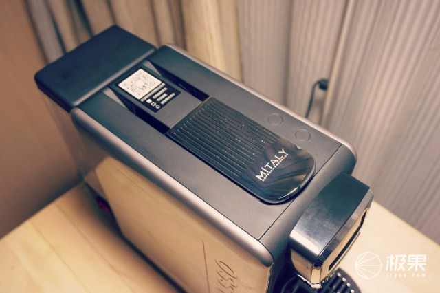 機身頂部是膠囊倉,打開亮鉻色的金屬把手,就可以發(fā)現(xiàn)下面的膠囊型孔狀所在,而在后部分還有個二維碼,掃描可以了解到更多關(guān)于MiTALY的信息。