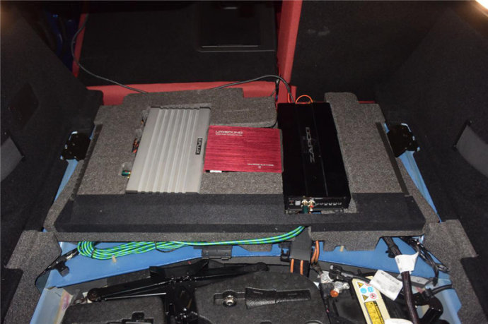 優(yōu)美聲DA608S DSP音頻處理器、佛倫詩FS804四聲道功放和駭客ST-1650單聲道低音功放并排安裝座椅下面