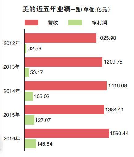 從2012年到2016年,美的集團營收從1026億元增長到1590億元,歸母凈利潤從32.6億元增長到147億元;2017年前三季度,美的集團營收1869.5億元,歸母凈利潤150億元,雙雙超過2016年全年,創(chuàng)歷史新高。此外,2017年,美的集團以3630億元市值在中國制造業(yè)上市公司中排名第二。